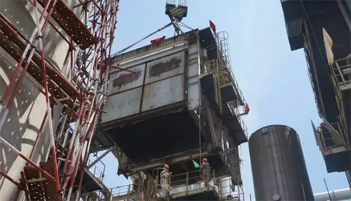 石油二廠蒸餾一車間檢修項(xiàng)目中余熱爐預(yù)熱器模塊更換任務(wù)是整個(gè)石化公司大檢修的關(guān)鍵核心工程。預(yù)熱器模塊位于爐體底部,總計(jì)重量260噸,更換過程中拆除配套煙道繁多,且多處位于高空,腳手架搭設(shè)及拆除安裝的測量定位難度較大,施工難度堪比預(yù)想。
